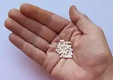 Комерційно крохмаль обробляється в декількох формах: гарячорозчинний порошок, шрот, попередньо зварені дрібні / грубі пластівці, прямокутні палички та сферичні «перлини».[4] Перлини — це найбільш широко доступна форма; розміри коливаються приблизно від 1 до 8 міліметрів в діаметрі, 2-3 мм є найпоширенішим.