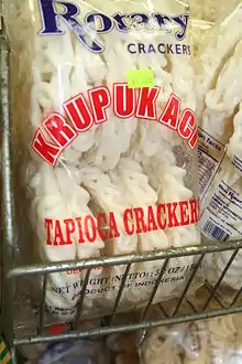 Крупук, або традиційні індонезійські крекери, є основним використанням крохмалю тапіоки в Індонезії. Найпоширеніший крупук — це kerupuk kampung або kerupuk aci, виготовлений з крохмалю тапіоки. Крохмаль тапіоки може бути ароматизований фаршеними креветками, як крупук уданг (крекер креветки) або крупук ікан (рибний сухар). Тонко нарізану або іноді досить густу маніоку також висушували на сонці і смажили, щоб їх виготовляли як крекери крипук сингконг (чипси маніоки або чипси тапіоки).[18] Варіант гарячої та гострої kripik singkong покриті цукром і перцем чилі відомий як kripik Balado[19] або keripik Санджай, спеціальність Букіттінгі міста в Західній Суматрі.