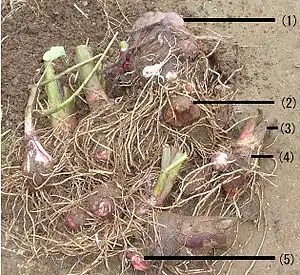 Коренева система мочкувата, утворює великі підземні бульби діаметром 6–8 см і масою до 4 кг, з безліччю бруньок, частина з яких починає рости й утворює вторинні, більш дрібні бульби. М'якуш бульб у різних сортів може бути білою або забарвленою у кремовий, жовтий, помаранчевий, рожевий чи червоний колір.