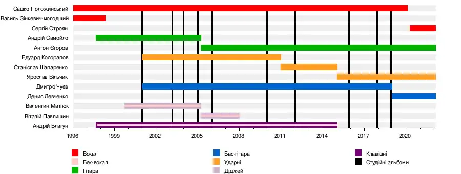 - Сашко Положинський — вокал, тексти (1996—2020)