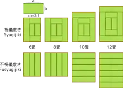 Магазини традиційно мали розмір 5 1/2 татамі, а чайні будиночки та чайні кімнати 4 1/2 татамі.