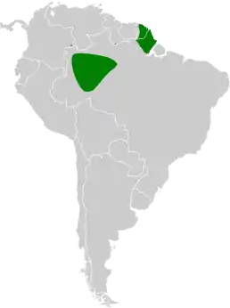 Вид поширений на півночі Бразилії та у Французькій Гвіані, а також є невеликі локалітети на півдні Гаяни, сході Перу та Колумбії. Мешкає у тропічних низовинних вологих лісах на висоті до 500 м над рівнем моря.