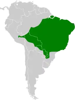 Вид поширений в Бразилії, Парагваї, Болівії, на сході Перу та північному сходу Аргентини. Мешкає у сухій савані та чагарникових заростях.