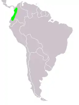 Вид поширений на заході Колумбії та північному заході Еквадору. Живе в низинному вологому лісі в субтропічних до тропічних регіонах.