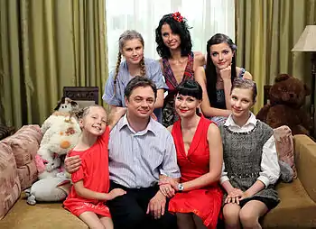 ![]() Головні герої зліва направо: Дар'я (друга донька), «Пуговка» (молодша донька), Марійка (старша донька), Сергій Олексійович (тато), Галина Сергіївна (четверта донька), Женя (третя донька) | |