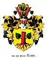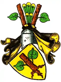 У золотому щиті натуральний липовий пень із кореневищем і двома зеленими листочками, що проросли по обидва боки. Намет чорний, підбитий золотом. У клейноді два пня з листочками на одному боці, і між ними павиний хвіст.