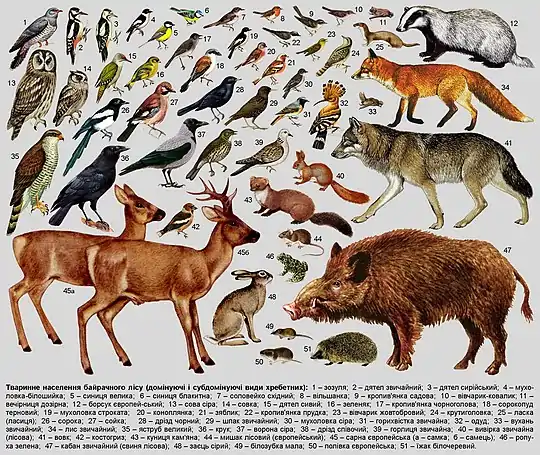 - байрачнолісовий (сукупність тваринних угруповань байрачних лісів);