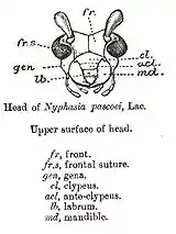 Між очима, вище потилиці розміщене тім'я, яке на передній частині переходить у лоб. На лобі, між очима, розташовані вусики (антени) — це багаточленикові придатки, що виконують функції органів дотику й нюху, основи яких знаходяться у вусикових впадинах. Кількість члеників вусиків у різних родин твердокрилих дуже сильно варіює, так само як і їх форма. На передній частині лобу наявний шов, який відмежовує, від останнього, наличник. З боків голови, нижче очей, розміщені щоки.