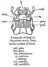 Ротові органи жуків пристосовані для подрібнення твердої їжі — верхні щелепи мають жуйний край з розвиненими зубцями. Зубці лівої щелепи входять у заглибини правої. Максили складаються з основного членика та стовпчика, на якому є пара нижньощелепних щупиків; він закінчується рухомо причленованими жуйними лопатями — зовнішньою та внутрішньою. Нижня губа має основний членик, або підборіддя, та дистальний членик, на якому є дві пари жуйних лопатей. До ротового апарату належить також м'ясистий виріст ротової порожнини — гіпофаринкс. На нижній частині голови між шиєю та ротовим апаратом знаходиться горло. Його передня і найвужча частина, яка прилягає до нижньої губи називається субментумом або підборідком, а поздовжні боріздки біля його основи — горлові шви.