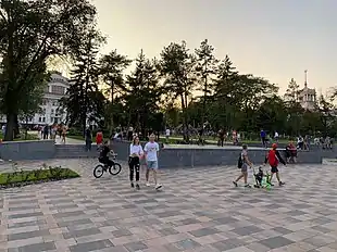 У 1948 році біля східного входу до скверу була встановлена бетонна фігура Андрія Жданова з піднятою рукою. Із часом монумент почав руйнуватися і в 1960-х роках його місце зайняло гранітне погруддя Жданова, демонтоване у 1989 році під тиском громадськості міста.