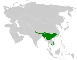 Вид в Південно-Східній Азії від східних Гімалаїв до півдня Китаю та Індокитаю. Його природними середовищами існування є субтропічні гірські та помірні ліси.