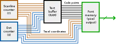 Координати в текстовому буфері направляються, як неважко зрозуміти, в текстовий буфер. Той повертає код символу і атрибут. Код символу, X і Y в шрифті проходять через шрифтову пам'ять, яка повертає один біт — 0, якщо в цій позиції фон, і 1, якщо зображення. Схема застосування атрибута (на малюнку праворуч не зазначена) перетворює лінії атрибуту і цей біт в остаточний сигнал, придатний до прогону через ЦАП. У простому випадку ця схема — мультиплексор на два входи по 4 біта, що перемикає між кольором зображення і кольором фону. Ця ж схема малює текстовий курсор.
