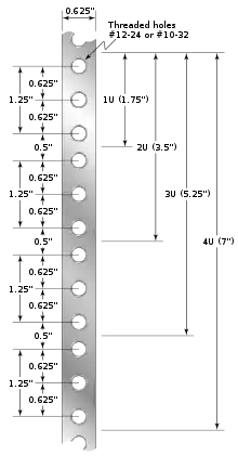 Кріпильні отвори в стійці відповідають кріпильним елементам на фронтальній площині обладнання, що монтується у стійку і розташовуються на вертикальних елементах стійки з періодом в 1,75 дюйма (44,45 мм). Ця величина задає дискретність розміру устаткування по висоті і утворює одиницю виміру, звану стійковим юнітом («U»). Таким чином, для впорядкування розміщення обладнання в стійці, переважно використовувати корпуси обладнання які мають висоту кратну цілому число юнітів.