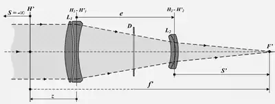 Схема телеоб'єктиву лінзової системи. H - головна задня площина; D- площина діафрагми; f - задня фокусна відстань