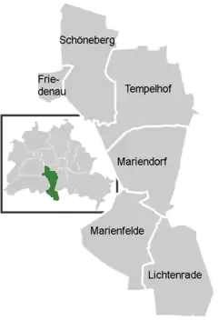 Округ обмежується південною частиною Старого Берліна, розташовується далі на південь до межі Землі Берлін і складається з шести районів.