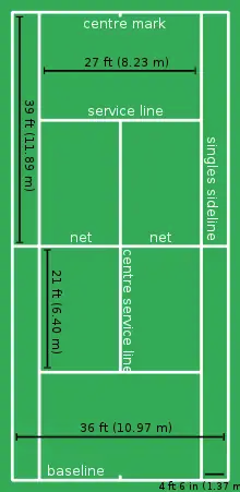 Розміри і лінії на тенісному корті вказані на рисунку праворуч. Усі довжини наведені у футах. Навколо корту повинен бути вільний простір для забігання гравців.