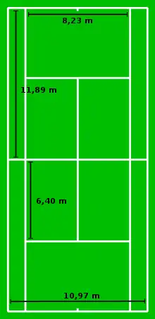 Для парного матчу центри стовпчиків кріплення сітки повинні перебувати на відстані 3 фути (0,914 м) із зовнішнього боку кожної бічної лінії парного корту.