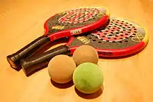 Губчаста кулька розміром 64 мм в діаметрі. М'яч можна подавати на руку. По м'ячу б'ють лопаттю, що простягається на 460 мм і яка може мати до 87 отворів розміром не більше 9,5 мм в діаметрі для поліпшення аеродинаміки. [8]
