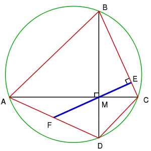 Якщо вписаний у коло чотирикутник має взаємно перпендикулярні діагоналі, які перетинаються у точці , то пряма, що проходить через точку і є перпендикулярною до однієї з його сторін, ділить протилежну до неї сторону навпіл. |