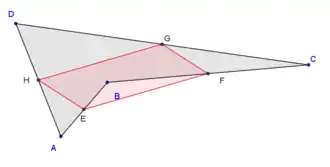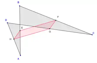 Проведемо діагональ AC. Відрізки EF та GH будуть середніми лініями трикутників і . За теоремою про середню лінію, відрізки будуть паралельними до діагоналі, а, значить, і один до одного. Повторивши аналогічні міркування для діагоналі BD, отримуємо, що протилежні сторони чотирикутника EFGH взаємопаралельні, і, за ознаками, це — паралелограм.