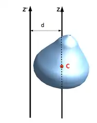 де — радіус-вектор відстаней між старою (яка проходить через центр масс) і новою віссю обертання. Тоді вираз для момента інерції набуде вигляду :
