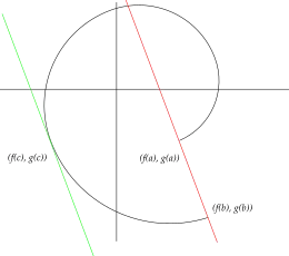 F(t) є функція ℝ→ℝ×ℝ: F(t)=(f(t),g(t), t∈[a;b]. Існує деяка дотична до цієй функції така, що вона паралельна до прямої [(f(a);g(a)), (f(b);g(b))]