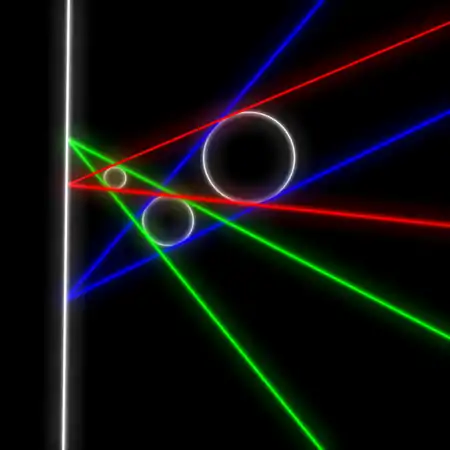Теорема Монжe. Червоним, синім і зеленим показані пари загальних зовнішніх дотичних.
