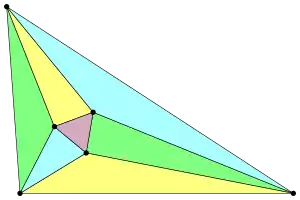 На кресленні праворуч три різнокольорових кута при кожній вершині великого трикутника рівні між собою. Теорема стверджує, що незалежно від вибору великого трикутника, маленький фіолетовий трикутник буде рівностороннім.