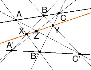 Нехай прямі проходять через точку A, проходять через точку A'. перетинає та в точках B і C, перетинає та в точках C' і Z, перетинає та в точках B' і X. Тоді прямі BC', B'C та XZ перетинаються в одній точці (на кресленні — Y) або паралельні. |