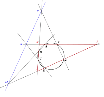 Якщо ABCD — чотирикутник, вписаний в лінію 2-го порядку, то точки перетину дотичних в вершинах С і D відповідно зі сторонами AD і ВС і точка перетину прямих А В і CD лежать на одній прямій. |