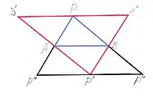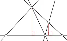Нехай одна з даних прямих не проходить через одну з точок перетину . Знайдемо точку перетину і пряму, для яких відстань менша, ніж від до . Оскільки число перетинів скінченне, це дасть суперечність. Випадок, коли через проходить пряма, не паралельна , зображено на малюнку. Якщо ж третя пряма, що проходить через , паралельна до прямої , то розглянемо трикутник , середні лінії якого утворюють трикутник , де і — точки перетину двох прямих, що проходять через , з прямою . Якщо третя пряма, що проходить через , не перетинає відрізка , то відстань від точки до неї менша, ніж до . Аналогічно, якщо третя пряма, що проходить через , не перетинає відрізка , то відстань від точки до неї менша, ніж до . Якщо ж третя пряма, що проходить через , перетинає відрізок і третя пряма, що проходить через , перетинає відрізок , то виникає точка перетину цих прямих. Якщо вона не збігається з , то вона ближче до прямої , ніж . Якщо ж вона збігається з , то можна застосувати вищенаведене міркування до неї і прямої . Виникне трикутник , середні лінії якого утворюють трикутник . Замінюючи тепер у наших міркуваннях трикутник трикутником і діючи далі аналогічно, отримуємо суперечність зі скінченністю множини. ■
