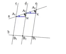 Нехай прямі і перетинають паралельні прямі у точках і відповідно (дивитись праворуч Малюнок 2).