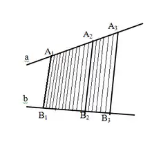 Нехай дано паралельні прямі , які перетинають прямі і , причому (дивитись праворуч Малюнок 1).