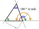Скористаємося позначеннями на рисунку праворуч. Оскільки, сума кутів трикутника буде 180°: