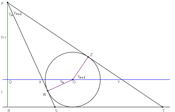 Проведемо через центр O вписаного в трикутник PST кола пряму QY, паралельну до базової прямої. Це коло дотикається до променів у точках W і Z. відрізок PQ має довжину , а відрізок QR має довжину , що дорівнює радіусу вписаного кола.