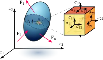 Основними поняттями теорії пружності є напруження, що діють на малих площинках, котрі можна уявно провести в тілі через задану точку P, деформації малої околиці точки P і переміщення самої точки P. Точніше кажучи, вводяться тензор механічних напружень , тензор малих деформацій і вектор переміщення ui. Коротке позначення , де індекси i, j набувають значень 1, 2, 3 (або x, y,z) слід розуміти як матрицю у видах: