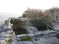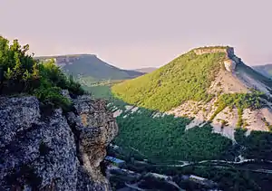 Комплекс розташований на вершині гори-останця висотою 535 м над рівнем моря (225 м над оточуючими долинами). Висота урвищ з півдня та заходу досягає 12 м. Найкраще збереглися сліди перебування населення — комплекс печер (близько 250 камер), які відображають всю різноманітність типів, які зустрічаються в печерних містах Криму.