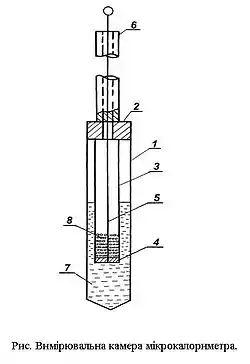 Для визначення закономірностей змочування сипкого матеріалу застосовують мікрокалориметр, наприклад ДАК-1-1. У циліндр 1 поміщають рідину закривають циліндр кришкою 2 з наглухо закріпленим на ній патроном 3 з наважкою сипкого матеріалу 8. Патрон знизу закривають дном 4, який являє собою щільно підігнану шайбу з фторопласту з отвором у центрі D = 0,8 мм. Цей отвір під час збірки та термостатування закривався штифтом 5 з нержавіючої сталі відповідного діаметра. Другий кінець штифта через отвір у тримачі 6 виходить з калориметру і слугує для відкривання отвору на дні патрона. Зібрану таким чином ампулу поміщають в термостатировану камеру калориметра і при досягненні теплової рівноваги за допомогою штифта відкривають отвір на дні патрона. Рідина з ампули 1 перетікає у патрон 3, викликаючи при цьому тепловий потік, обумовлений змочуванням сипкого матеріалу рідиною. Розрахунок теплоти змочування Q (Дж/кг) здійснюється за формулою:
