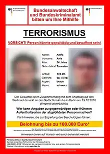 21 грудня, поліція оголосила, що розслідування знайшло в вантажівці документи на ім'я громадянина Тунісу Аніса Амрі. Влада розпочала пошук підозрюваного по всій Європі.[25] За інформацію, яка допоможе затримати ймовірного терориста, оголошено винагороду в розмірі 100 тисяч євро.[26]