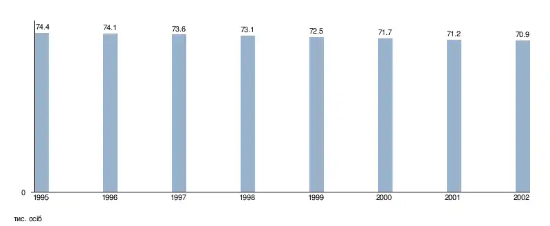 - працездатне населення: жінки у віці 17-55 років — 16840 осіб, 5461 — міське, 11409 — сільське; чоловіки — 17-60 років — 18459 осіб, міське — 5493, сільське — 12966