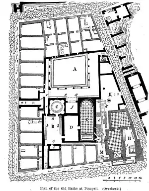 У цій статті використовується, як приклад, будова Старих Лазень в Помпеї, розташованих поруч з Форумом, які збереглися найкраще з-поміж тих, що дійшли до наших часів. Всі посилання стосуються загального плану, зображеного праворуч[6]