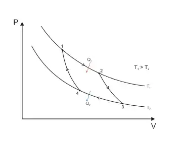 Цикл Карно (мал. 2) в координатах P — V є оборотний круговий процес, який характеризується наступною послідовністю процесів: ізотермічне розширення (1 ─ 2) при температурі , адіабатичне розширення (2 ─ 3), ізотермічне стискування (3 ─ 4) при температурі і, що замикає цикл, адіабатичне стискування (4 ─ 1). Робоче тіло — ідеальний газ.
