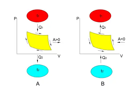 Прямий цикл A (мал.1) використовується в тепловому двигуні. Тепло підводиться з джерела вищих температур ─ нагрівача і частково відводиться до джерела нижчих температур — холодильника . Робота, отримана в тепловому двигуні, дорівнює різниці кількостей підведеного і відведеного тепла :