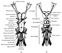 ![]() Left Термінальний нерв показаний на вентральній поверхні головного мозку катрана | |