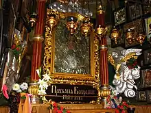 Поясний образ Богородиці з малим Ісусом на руках. Ікона від 1920-х років — у срібному окладі (ризах), постаті — короновані[6].