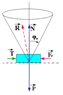 Розглянемо тіло, що перебуває в стані граничної рівноваги на шорсткій поверхні. В залежності від дії заданих сил напрям граничної реакції F0 може змінюватися. Геометричне місце всіх можливих напрямків реакції F0 в граничних умовах утворює конусну поверхню — конус тертя. Приведемо усі активні сили, що діють на тіло, до однієї рівнодійної R, яка утворює кут α з нормаллю до поверхні. Така сила робить подвійну дію — її нормальна складова визначає реакцію поверхні N і, як наслідок, граничну силу тертя , дотична складова сили R намагається цю силу перебороти. При збільшенні сили R будуть пропорційно зростати обидві складові. Отже стан спокою або руху тіла не залежить від модуля сили R і визначається тільки кутом її прикладання α.