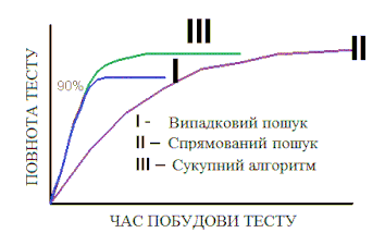Зазначимо, що час випадкової генерації {t} набагато менше часу моделювання. Для спрямованих алгоритмів час побудови {t} порівнянний з часом моделювання, а в ряді випадків значно більше його. Спрямовані алгоритми, таким чином, виконуються повільніше алгоритмів випадкового пошуку, але забезпечують велику повноту тестів (крива ). Найбільш доцільно використовувати алгоритми: спочатку алгоритм випадкового пошуку. А після зниження його ефективності до певного рівня спрямований алгоритм (крива ).