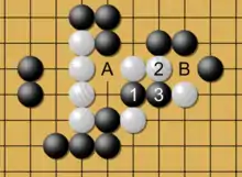 Хід чорних 1 — тесудзі (варікомі), білі не можуть одночасно захистити «A» і «B»