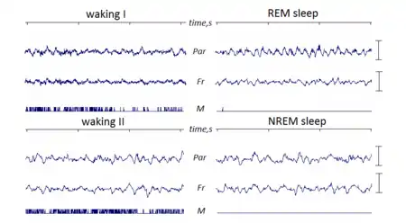 Верхня лінія - секундні відмітки часу, Par - активність тім'яних поверхневих електродів (розташовані близько до гіпокампу), Fr - активність префронтальних поверхневих електродів, M - датчик рухів, амплітудна шкала 1000мкВ. Waking I - поведінка І типу (довільна, орієнтувальна, досліджувальна), ЕЕГ містить виражений тета-ритм (коливання близько 8Гц) та швидкі низькоамплітудні коливання. Waking II - поведінка ІІ типу (автоматичні, ритмічні рухи або іммобілізація в стані притомності), ЕЕГ складається з нерегулярних високоамплітудних коливань. REM сон характеризується вираженим тета-ритмом (особливо у парієтальних відведеннях) та атонією скелетних м'язів (відсутність рухів), ЕЕГ виглядає подібно до waking I але містить менше високочастотних коливань. NREM або повільнохвильовий сон характеризується десинхронізованою ЕЕГ із високоамплітудними дельта-хвилями (1-4Гц), ЕЕГ виглядає подібно активності waking II.