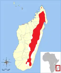 Ендемік Мадагаскару. Трапляється вздовж східного поясу гірських дощових лісів від Мангангаріво та Царатанани на південь до Андохахели.
